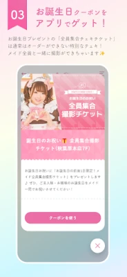 お誕生日やランクアップなど、さまざまなタイミングでクーポンをプレゼント!お誕生日クーポンはその場にいるメイド "全員" とチェキを撮れるチケットなど、豪華なプレゼントもあるのでぜひ活用してください。