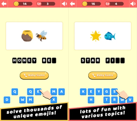 Play with BABY SUMO from Japan who is naturally good at identifying emojis. BABY SUMO is multi-talented. Not only is he cute and good at wrestling, he is also pretty good at speaking English, and of course at solving Emoji Puzzles in a native manner! Are you stuck on a hard Emoji puzzle? What are these Emoticons describing? Do not fear, BABY SUMO is here to save the day!