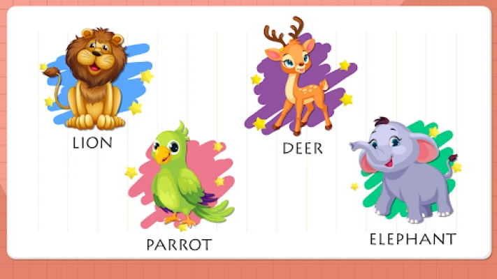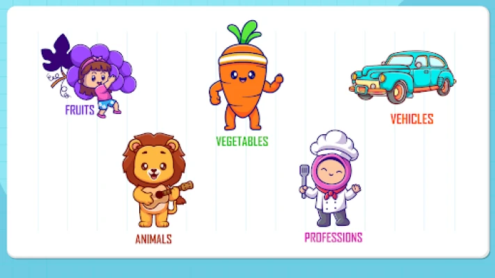 In this app we added different concepts like Numbers, Alphabet upper case and lower case, Colors, Shapes, Fruits, Vegetables, Vehicles, Professions, Animals.