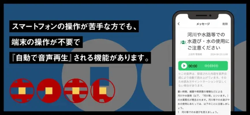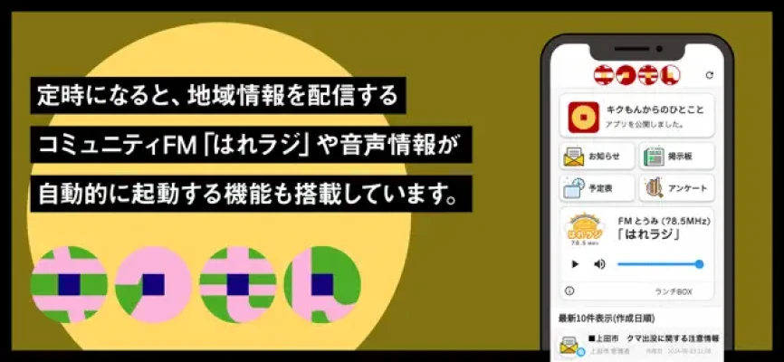 【キクもん 〜上田市地域コミュニケーションアプリ〜 の特徴】◆地域や自治会、地域団体等が発信する様々な情報を「音声」や「文字」で受信できます。◆掲示板、アンケート、スケジュールなど様々な方法で発信される地域の情報を手に入れることができます。◆上田市内で活動する団体のグループに入ることで、生活を豊かにする地域情報を手に入れる事が出来ます(今後、随時追加予定)。◆コミュニティFM「はれラジ」が毎日の生活に地域情報をお届けします。