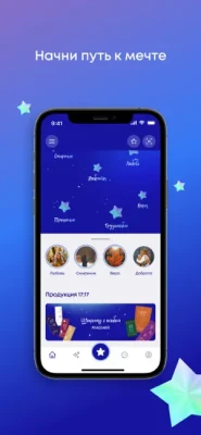 • открыть путь к мечте, состоящий из 12 звёзд-ценностей. Эти ценности помогут укрепить веру в мечту и двигаться вперед несмотря на трудности и неудачи. Научат радоваться возможности помогать другим и с благодарностью принимать поддержку и помощь, шаг за шагом приближая тебя к мечте.
