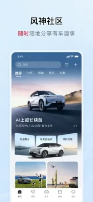 探索:可进行发帖、点赞、回复等互动交流,千万积分等您来。服务:查询经销商相关信息,线上预约保养/维修服务。选车:查询风神旗下各款车型(全新一代AX7、全新AX5、全新AX3、E70等)的参数配置、图片、价格等详细信息。我的:车主认证及解绑,查看领券、发帖等记录。