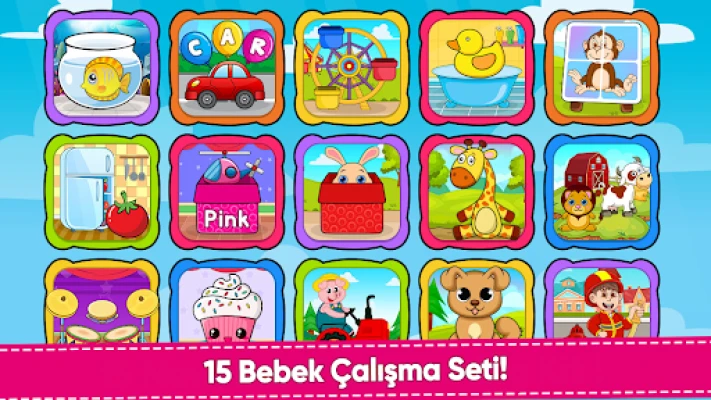 Bu Bebek Oyunları, çocuklar için 15 eğitici oyunun yanı sıra Resim, Diller, Sayılar, Sosyal Bilgiler vb. gibi birçok Çalışma Sayfası içerir.
