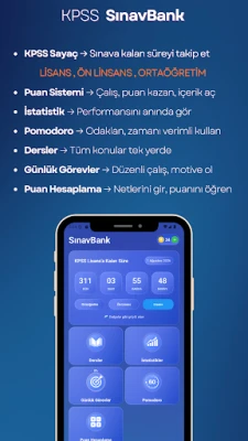 KPSS Sınav Bank, 2026 KPSS’ye hazırlanan adaylar için konu özetleri, hap bilgiler, çıkmış soru dağılımları, testler ve güncel puan hesaplama araçları ile sınav başarını artırmanı sağlar.