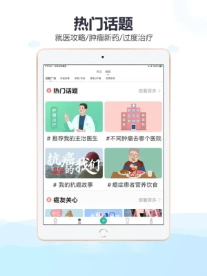 【社区/热门话题】为肿瘤患者提供专属交流平台,可以快速找到病情相似的病友,分享治疗经验、饮食禁忌和生活日常等。