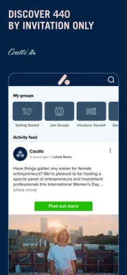 Named after Coutts’ headquarters on the Strand, 440, is an invite-only social networking app for the Coutts community. 440 is designed to help Coutts clients network with other likeminded individuals and build their connections digitally.