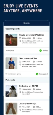 Use 440 to: • Connect with other Coutts clients, Coutts leaders and key people in the Coutts family • Join different interest groups to connect with likeminded individuals • Access an exclusive online events programme • Access articles, videos and podcasts on a range of topics