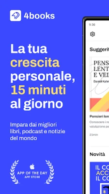 - L’apprendimento non ha limiti con 4books. Impara dove e quando vuoi con i nostri audiolibri, podcast e libri. Utilizza 4books da mobile o da web e accedi ai contenuti in formato audio o testo. Grazie all'ampia scelta di libri podcast e audiolibri internazionali, potrai scoprire titoli non ancora presenti in italiano e riassunti in pillole da 15 minuti al giorno.