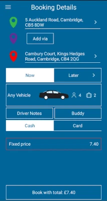This app is intended for U.K use only, and therefore all addresses are restricted to within the UK. This app allows cash bookings to be made within a 15 mile radius of Cambridge City Centre, there is no radius restriction on credit/debit card bookings.