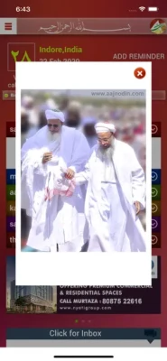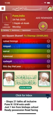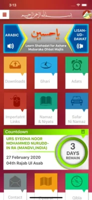 1. Namaz Timings with reminders 2. Miqaat 3. Sadaqa 4. This Day That Year 5. Vepaar 6. Important Nos 7. Downloads (Madeh, Marasi, Rasa etc) 8. Adat Section - providing daily reminders for adat like Praying Quran, Datan etc 9. Ziyarat - locations with contact details and history 10. Notifications
