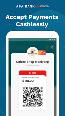 ABA Merchant allows accepting payments by presenting universal QR code that works for ABA PAY, Visa QR and Mastercard QR payments. Your customers can simply scan your QR code and pay from their ABA account or card via ABA Mobile app or with banking applications. You will get money directly in your ABA bank account.