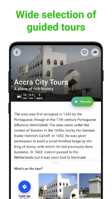 SmartGuide won’t let you get lost and you won't miss any must-see sights. SmartGuide uses GPS navigation to guide you around Accra at your convenience at your own pace. Sightseeing for the modern traveler.
