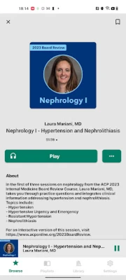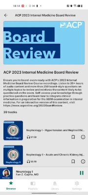 Expand your clinical knowledge with select audio versions of ACP educational products, such as Internal Medicine Board Review Course Recordings and the CME 160 package of recordings from ACP’s Internal Medicine Meeting. The ACP Audio app features over 200 hours of medical education content including clinical lectures and associated Q&A. Listen to tracks and playlists in a variety of topic areas from national experts as they review clinical information and answer targeted questions. You can play audio lectures in any order, create a list of favorite tracks, view your listening history, and download tracks to listen offline.
