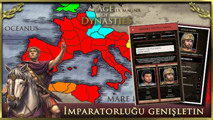 - hanedanlık ve yetenekli insanlar: imparatorluğunuzun komutası altında hanedanlığınızı zenginleştirin ve Roma Cumhuriyeti'nin kurulmasını önleyin. Geleceğin imparatorunu büyük bir fatih ve efsanevi imparator olarak yetiştirmek için, stratejik ve taktiksel olarak yetenekli insanları seçerek varislerinizi eğitin.
