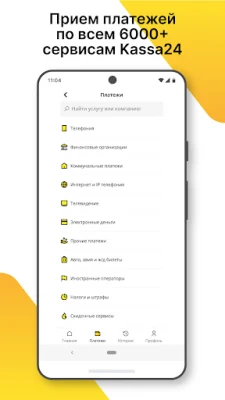 Функции: 1. Прием платежей по всем сервисам от Каssa24; 2. Журнал принятых платежей, который заполняется автоматически; 3. Фискализация платежей с возможностью настройки через мобильный терминал.