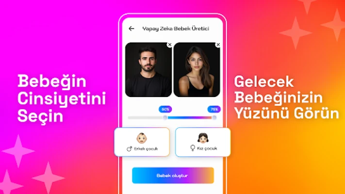 AI Future Baby Face Generator'ı hemen indirin ve gelecekteki bebeğinizin nasıl görünebileceğini görün. AI bebek oluşturucunuz ile yaratıcı olun ve eğlenceyi paylaşın!