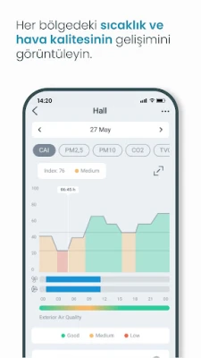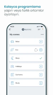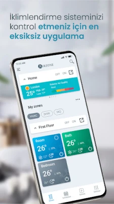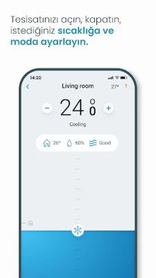 Uygulamamız sayesinde klimanızı dilerseniz koltuğunuzdan veya yatağınızdan, dilerseniz ofiste ya da parktayken cep telefonunuz aracılığıyla kontrol edebilirsiniz. Daha az maliyetle daha fazla konfor için dilediğiniz odanın klimasını açın ya da kapatın ve her odanın sıcaklığını ayrı ayrı ayarlayın.
