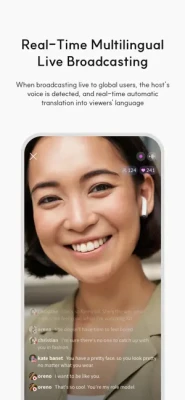 • Real-time AI translation of messages and live stream audio in over 50 languages. • Effortless live stream hosting for a multilingual audience. • Chat with global users speaking different languages through automatic translation.