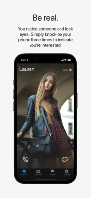 Be true. You notice someone and lock eyes. The opportunity to meet is fragile and fleeting. Sometimes fate deserves a second chance. Simply knock on your phone three times to indicate you’re interested in someone, or receive potential matches when others knock for you. Never settle.