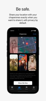 Be safe. Safety is important to you, so you use the complementary chaperone service with your friends. Simply knock on your phone six or more times to notify your chaperones with your location. Your location and profile are private by default, and each is shared only when you want it shared. Never settle.