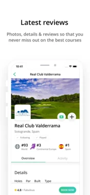 Be inspired by the world’s globetrotters sharing their favorite destinations. Play golf courses you have never thought of before and discover breathtaking places. Easily filter golf courses by continent, country, state, ratings and reviews. Photos, videos, descriptions, reviews and weather forecast will help you make the most out of every golf outing.