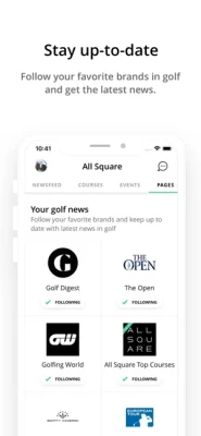 Stay up-to-date with your favorite golf brands and media. Follow the PGA Tour, European Tour, TaylorMade Golf, Callaway Golf, Golf Digest… You can also follow golf clubs to get their latest news and special offers.