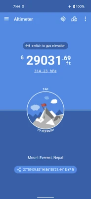 Altimetre, mevcut konumunuzda veya dünya üzerindeki herhangi bir konumda deniz seviyesinin üzerindeki gerçek irtifayı (MSL) almanızı sağlayan kullanışlı bir Android uygulamasıdır. GPS sinyalinden ham irtifa almak için cihazınızın konumuna erişim gerektirir ve çalışmak için ağ bağlantısı gerektirmez. EGM96 Dünya Gravitasyon Modeli kullanılarak deniz seviyesinin üzerindeki gerçek irtifa belirlenir. Ana özellikler şunlardır: