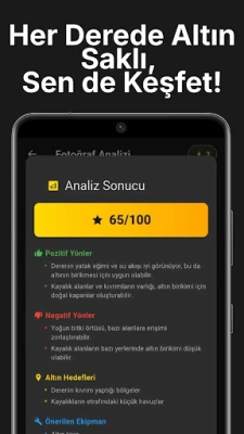 DİKKAT: Bu uygulama eğitim ve hobiye yönelik bir araçtır. Gerçek altın arama faaliyetlerinde profesyonel ekipman ve uzman desteği gerekebilir. Sonuçlar görsel analizine dayanmaktadır ve kesinlik bildirmemektedir.