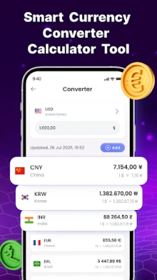🧮 Currency Calculator: Instantly calculate conversions with a simple, intuitive interface. Just type in the amount, and the money calculator shows the results in your selected currencies.