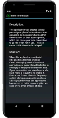 Açıklama: Bu uygulama boşta gitmekten telefonunuzun veri akışı önlemeye yardımcı olmak için kuruldu. Bazı taşıyıcılar veri bağlantısı Kullanılmadığı zaman tamamen boşta gitmek neden olabilir kendi erişim noktaları üzerinde ayarlanmış çok sıkı zaman aşımı var. Bu bile veri planınızı kullanmak için bir yetersizlik derece gecikmiş bildirimleri neden ve olabilir.