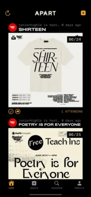 APART is the home of all social calendars. Follow friends, venues, artists, community organizers — find out where everyone is going and what they’re hosting, both in your personal circles and in your wider communities. Create events on APART to easily invite your friends and track who’s coming. Check your discovery page for events you might be interested in and find out what’s going on around you.