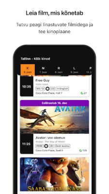 Sirvige kinokavasid, vaadake treilereid ja ostke kinopileteid tulevaste filmide jaoks. Kinosaalidele mugava juurdepääsu võimaldamiseks kasutage digitaalseid kviitungeid. Veelgi nauditavama kinoelamuse saamiseks kasutage iseteeninduskioskites suupistete ostmiseks oma konto ID-d.
