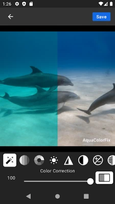 AquaColorFix Features: •Simple one tap underwater photo and video color correction. •Color Correction Adjust •Saturation Adjust •Hue Adjust •Brightness Adjust •Sharpness Adjust •Contrast Adjust •Exposure Adjust •Highlights Adjust •Shadows Adjust •Black Point Adjust •Save unlimited color corrected photos that include a watermark.