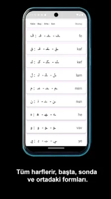 Uygulama ile tüm Arapça harflerin baştaki, ortadaki ve sondaki formlarını da öğreneceksiniz.