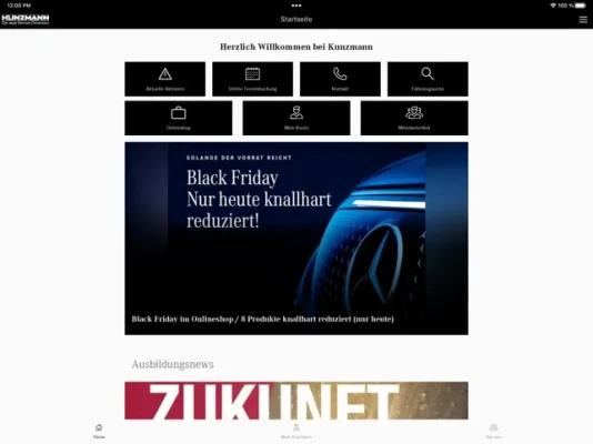 Sie können schnell und einfach Termine vereinbaren, nach Fahrzeugen suchen, in unserem Onlineshop stöbern oder Informationen zu aktuellen Events und Neuigkeiten aus der Kunzmann-Welt abrufen. Lassen Sie sich nichts entgehen! Auch der Bereich Karriere bei Kunzmann wurde in der App berücksichtigt.