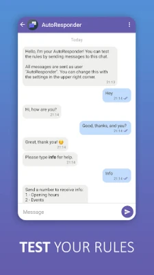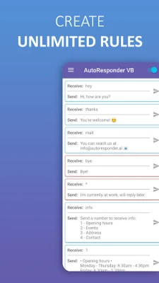 Bu sohbet botuyla alınan Viber mesajlarına özel olarak belirlediğiniz otomatik cevaplar verin. Her otomatik cevabı ihtiyaca göre özelleştirmek için pek çok ayar mevcuttur. Şimdi yükleyin!