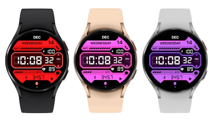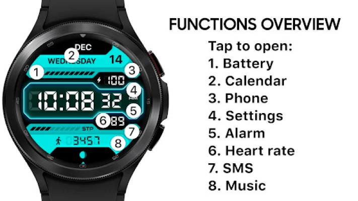 Supports watches running Wear OS 3 6 color themes, All languages, Digital time (12/24 hour clock), Watch battery level, Date, AOD, Pedometer, Heart rate, Alarm, Calendar, SMS, Phone, Music, Moon