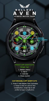 Ballozi AVEN is a modern realistic hybrid colorful watch face for Wear OS. This watch face has a lot of color combination to choose from and packed with editable complication and customizable app shortcuts.