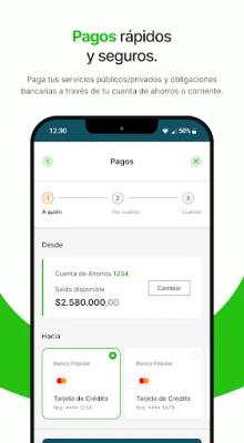 • Pagar servicios públicos y privados, obligaciones Banco Popular o Grupo AVAL y de cualquier tarjeta de crédito Visa o MasterCard