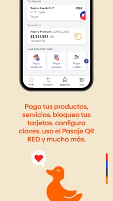 • Control total de tus tarjetas: Bloquea y desbloquea tu Tarjeta CuentaRUT, Cuenta Corriente o Chequera Electrónica. Cambia, recupera o activa la clave de tu tarjeta de débito para cajeros automáticos y compras en comercios.