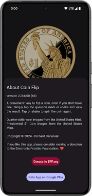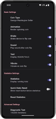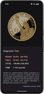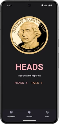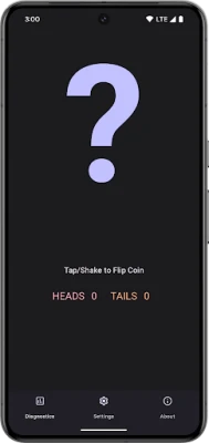 Soru işaretine dokunmanız veya sallamanız ve sonucu görüntülemeniz yeterlidir. Madeni parayı tekrar döndürmek için madeni paraya dokunun veya sallayın. Yerleşik Tanılama Testini çalıştırarak ve parayı 100.000 kez (veya daha fazla) çevirerek,sonuçları gerçek zamanlı olarak izleyerek çevirme algoritmasının gerçekten rastgele olduğunu doğrulayın. (Üzgünüm, hile yok!)