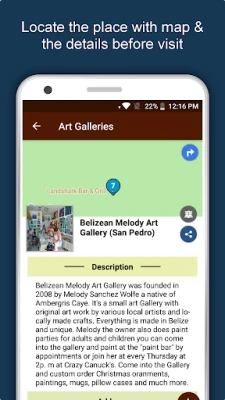 Apart from this, Belize Travel & Explore guides you Why, When and How to visit various places in Belize with precise location on the detailed Map. There are three ways to explore this app - Category view, City view and EduBank favorite places view. Pin your destinations and get the routes on the Map. Not only this, you can see exactly how the places look like with Street View integrated in this app. The app also has a feature to Rate and write Review/Experience regarding entity(s) through Login. Your Travel experience and rating will help the user community.