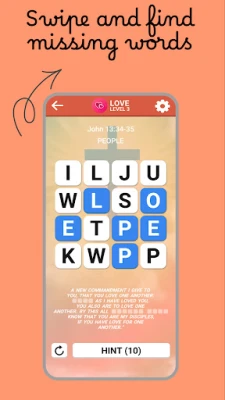 Each level of Bible Word Search presents you with a meaningful Bible verse that has one or more missing words. Your challenge is to find and select the missing words by sliding through the letter grid.