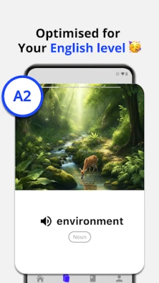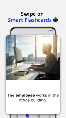 Each flashcard includes an image, audio, and example sentence to help you understand words in context. Swipe left to review again or right to move forward. The experience is simple, intuitive, and engaging.