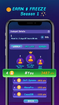 Season 2 has begun. Climb the leaderboard and get a chance to win up to 10 SOL each week (starting from 0.2 SOL, the jackpot increases every two weeks depending on the number of players there are).