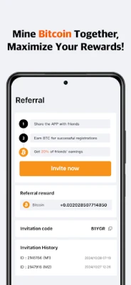 Build your mining empire! Earn 20% lifetime rewards from friends' activities + unlock team boosters. More referrals = Higher hash rates.