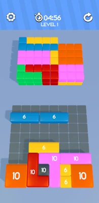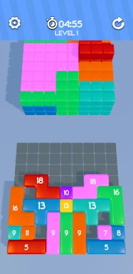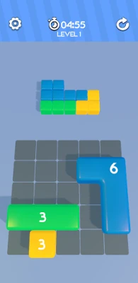Block Smash – Block Puzzle is a fast two-grid color puzzler. Place shapes on the lower grid. Reach the top edge to fire a color shot that clears matching cubes above. Plan angles, open lanes, chain clears—and empty the board before the timer hits zero.