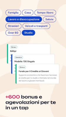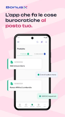 BonusX è l’app che raccoglie e classifica oltre 600 bonus pubblici e agevolazioni fiscali e ti propone quelli a cui potresti aver diritto in base al tuo profilo. Gestisce poi la burocrazia per: