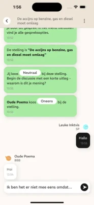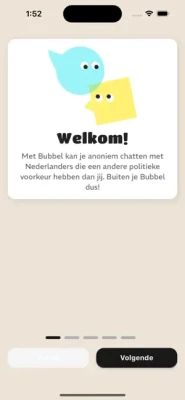 Bubbel is een platform voor 'politiek speeddaten', voor Nederlandse kiezers die in aanloop naar de verkiezingen écht uit hun bubbel willen breken. Op basis van je politieke oriëntatie word je gekoppeld aan iemand met een tegengestelde smaak. Vervolgens kan je in anonieme 1-op-1 chats aan de hand van prikkelende stellingen de discussie aangaan.