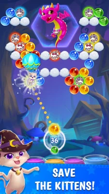 Pop bubbles and help Alice rescue the trapped kittens from the evil dragon in this magical adventure! Work your way through increasingly challenging bubble shooting puzzles and free the cats from evil piece by piece, pop and blast bubbles to victory!